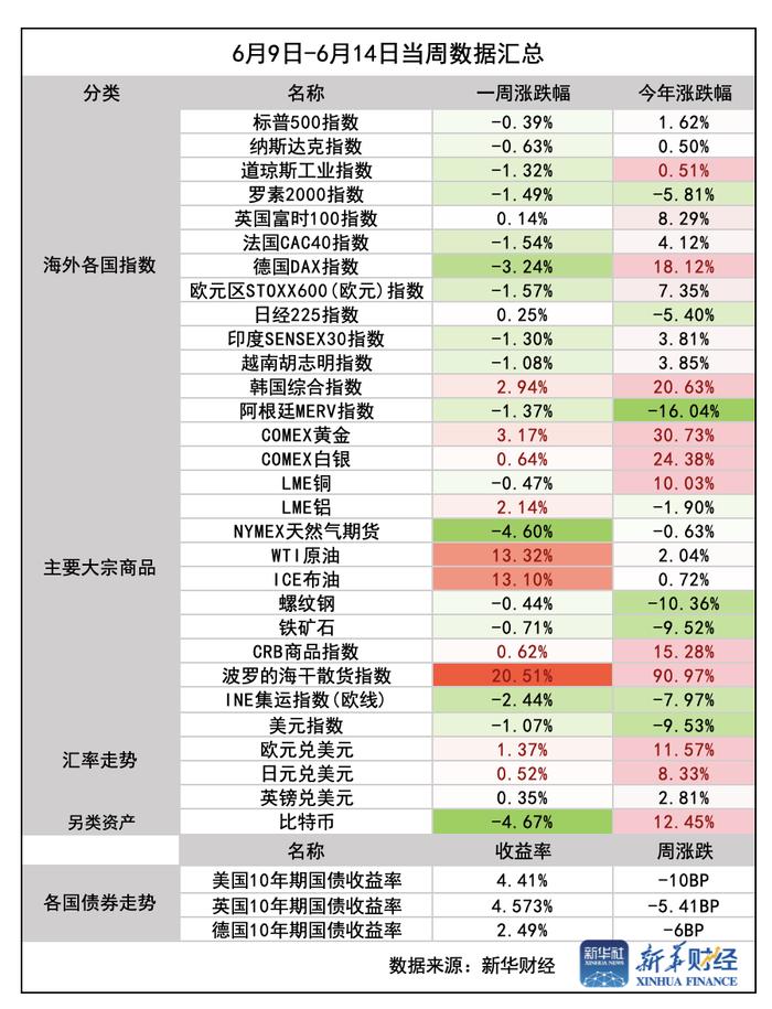 新华财经上海6月15日电(葛佳明)本周(6月9日-6月14日),美国通胀数据低于预期,市场对美联储年内降息押注攀升,中东冲突升级,全球资产价格波动加剧,国际油价飙升,黄金价格因避险需求大幅上行,全球主要股指多数下跌。